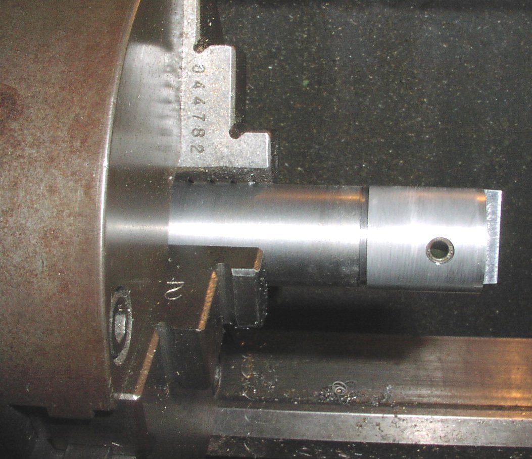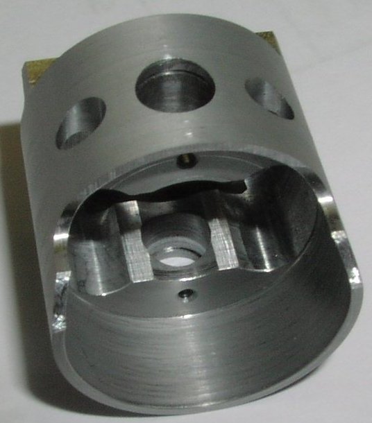 A decision must be made at this stage on the piston fit in the liner. in this instance I wanted the finished piston to interfere (start to bind in the liner) at 2.5mm (0.1") from top dead centre. The liner has been measured and the taper is known so the actual diameter of the piston can be calculated. On this engine the piston is 5mm (0.197") from the top of the liner at top dead centre, so the fit required is 7.5mm (0.295") from TDC. The piston is turned to 0.012mm (0.0005") oversize. Then the 0.75° taper is machined around the top of the piston including the baffle. The taper is machined so that after final lapping the width of the taper will be 2mm (0.080")approx. The cleaned liner is put over the piston and slid down until the piston just binds. This depth is measured with a depth gauge and the result noted. The piston is now lapped to the final diameter using the lapping tool shown on page 8 with 1000 grit carborundum mixed in engine oil. The lap is set to size by placing it over the piston and tightening the clamp screw until it is just free. A tiny amount of the grinding past is then dabbed onto the piston and the lap is put over the piston with the lathe stationary. The lathe is then started at about 50RPM and the lap is held and moved bacwards and forwards a few times (about 4 times) the lap is then removed, turned round and a 4 passes made. The lap is then removed and the piston cleaned with a solvent and dried carefully. The clean and dry liner is then put over the piston until it just binds and the depth from the top of the liner to the top of the piston is again measured with a depth gauge. This will give an indication of how much lapping is required to move the piston up the bore to the required position. The proceedure is repeated. The lap is reset each time by putting onto the piston and tightening the clamp screw till it just starts to drag. A tiny amount of new grinding compound is added each time. This is repeated until the required fit is achieved. Note: when removing the lap is should be done in a swift move whilst the lathe is running or it may bind. This proceedure sounds laborious but is actually quite straight forward in practice. Fitting the piston to the new engine took only about 1 hour and the lapping took only 10mins. The piston and liner must now be thouroughly cleaned. This is done using washing up liquid and an old toothbrush in hot water. All vestages of the lapping compound must be removed. The piston fit achieved by this method will not need any significent running in. The first engine had only 15mins on the bench before flying in the aeroplane. |