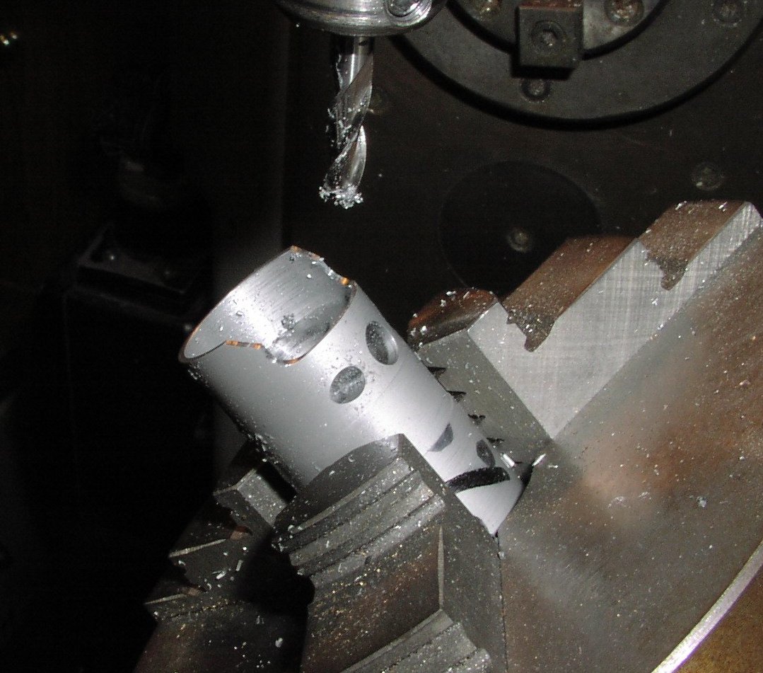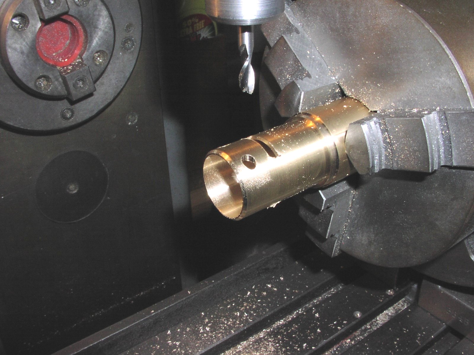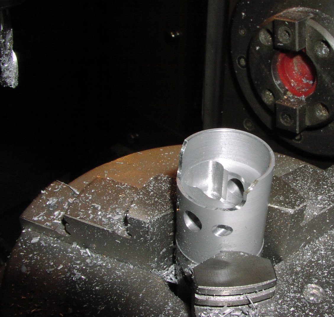 Machine outside diameters and tapered inside diameters from CZ121 brass rod. | Mill ports into the liner using the dividing head. |