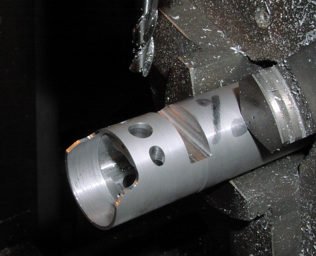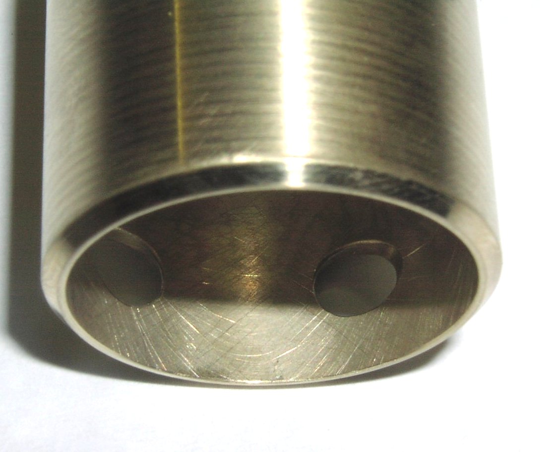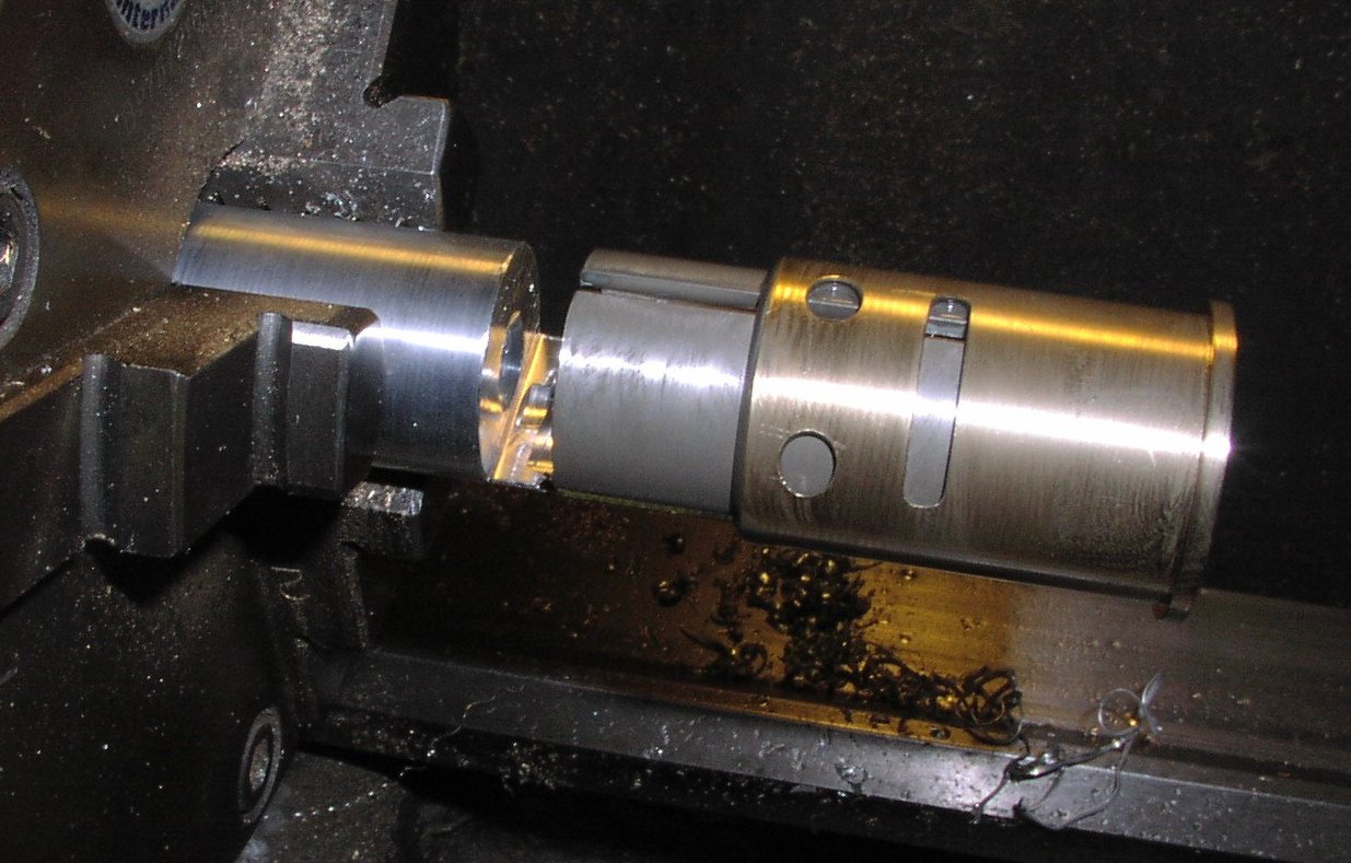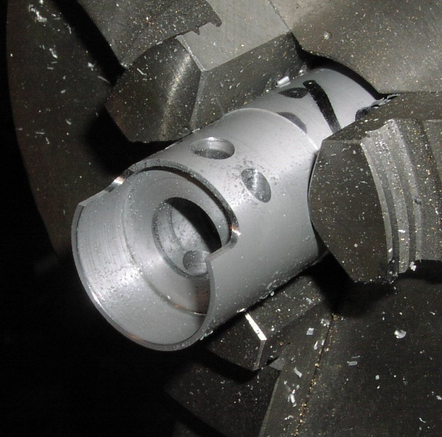 Machine outside diameters and tapered inside diameters from CZ121 brass rod. | Mill ports into the liner using the dividing head. |