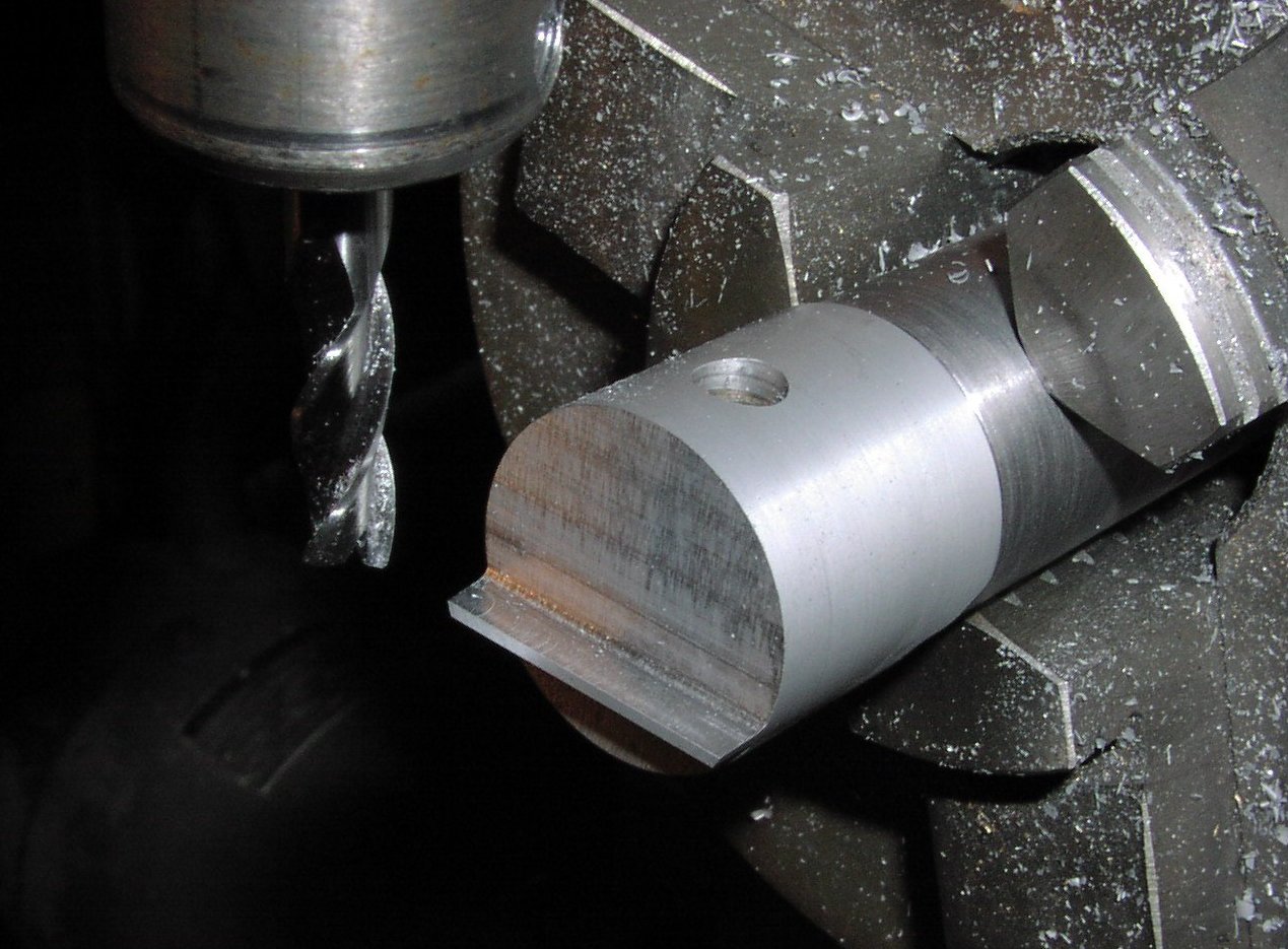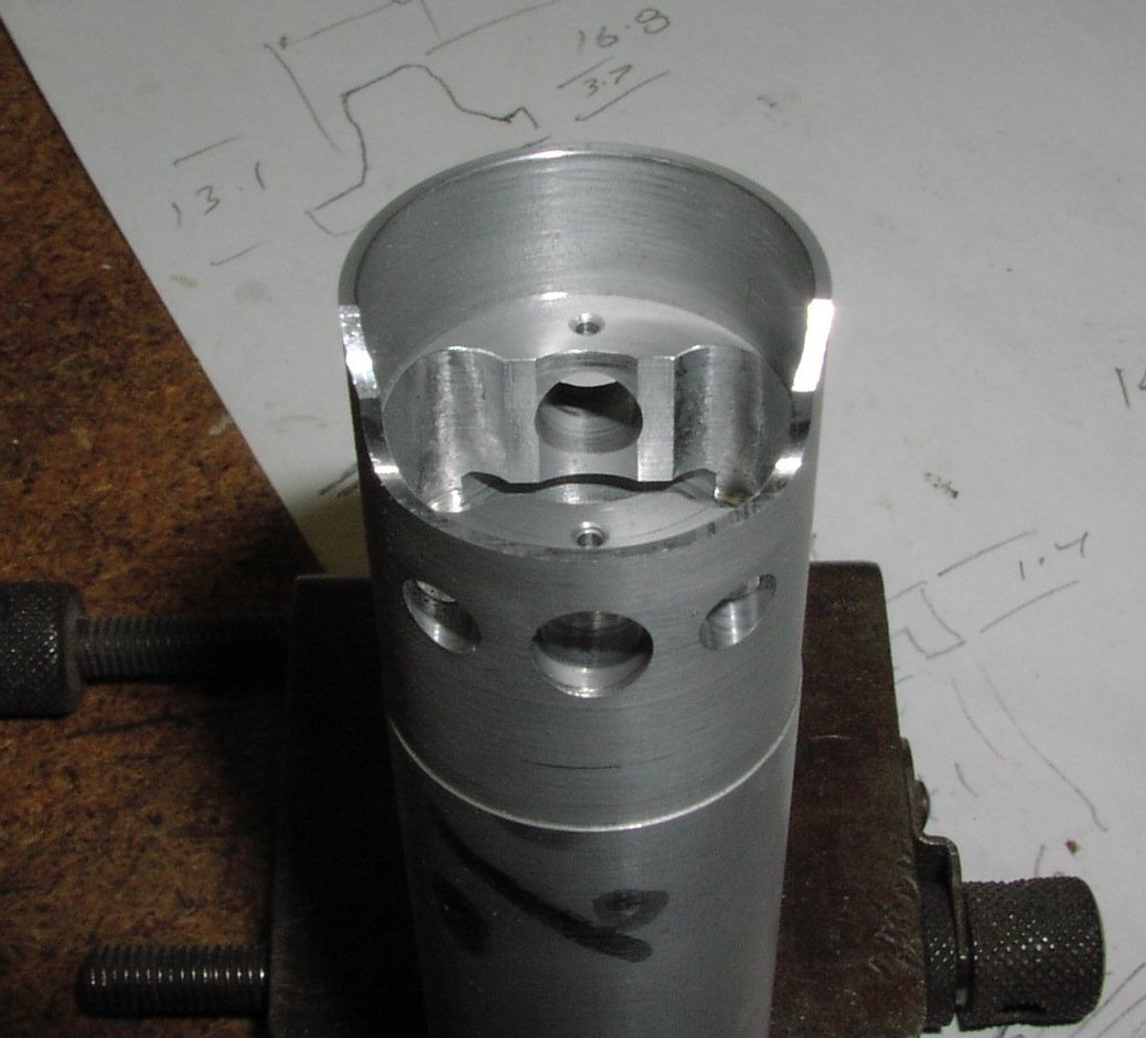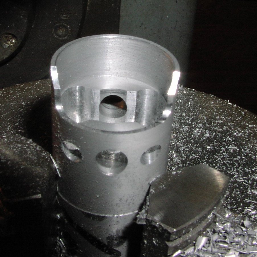 Machine the chanfer on the corner of the cutout in the piston (this is to ensure that the piston misses the bearing housing at the bottom of its stroke. | mill the inside of the piston. |
