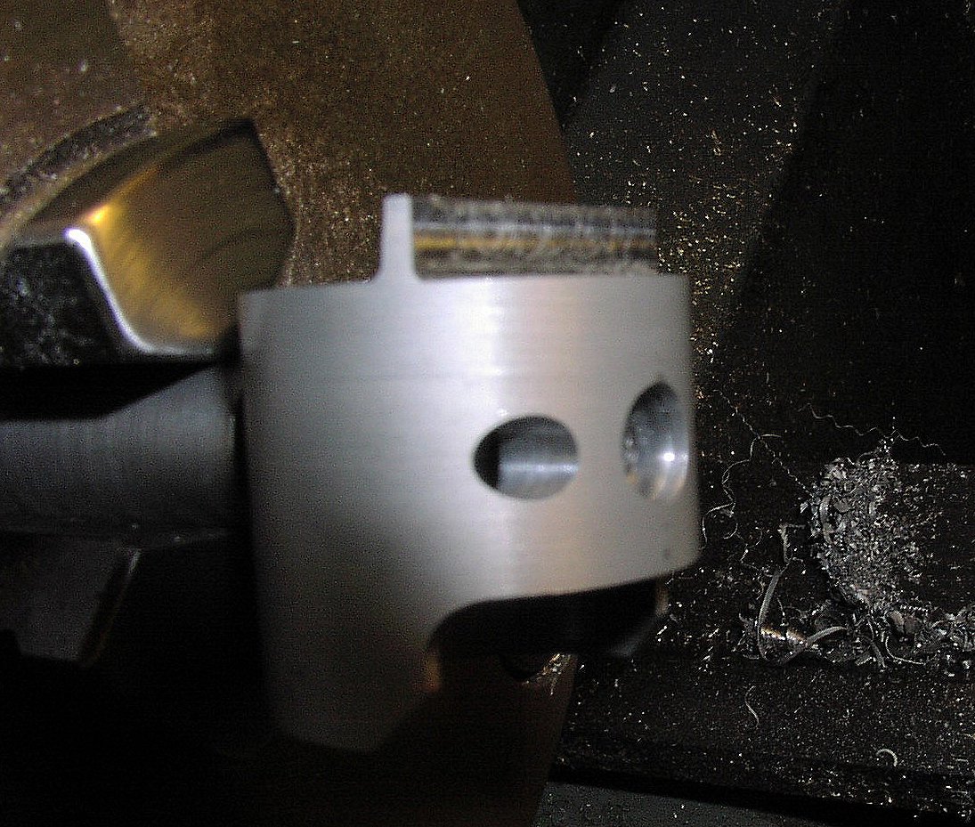 Mill the inside of the piston. | Showing the undercut under the gudgeon pin boss and the 2 lubrication holes. |