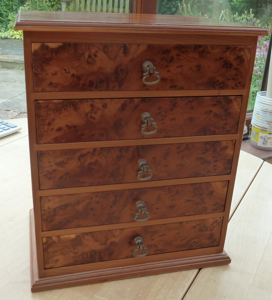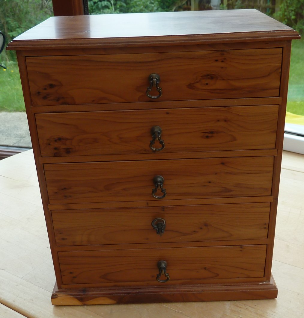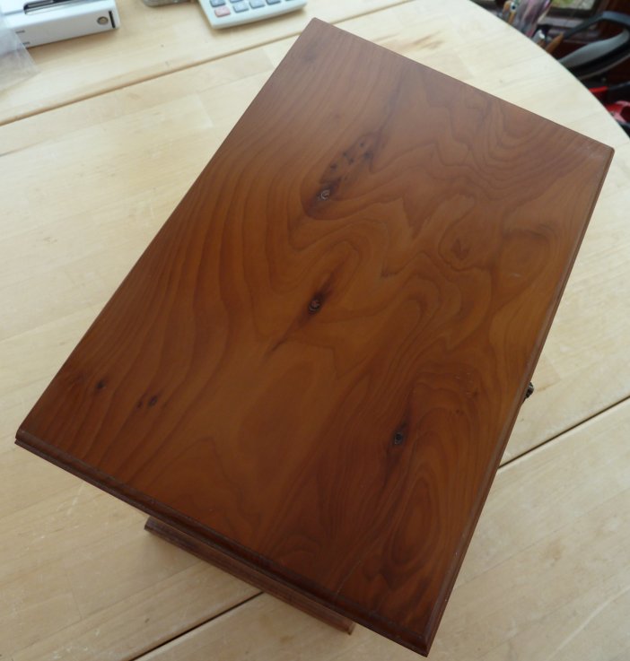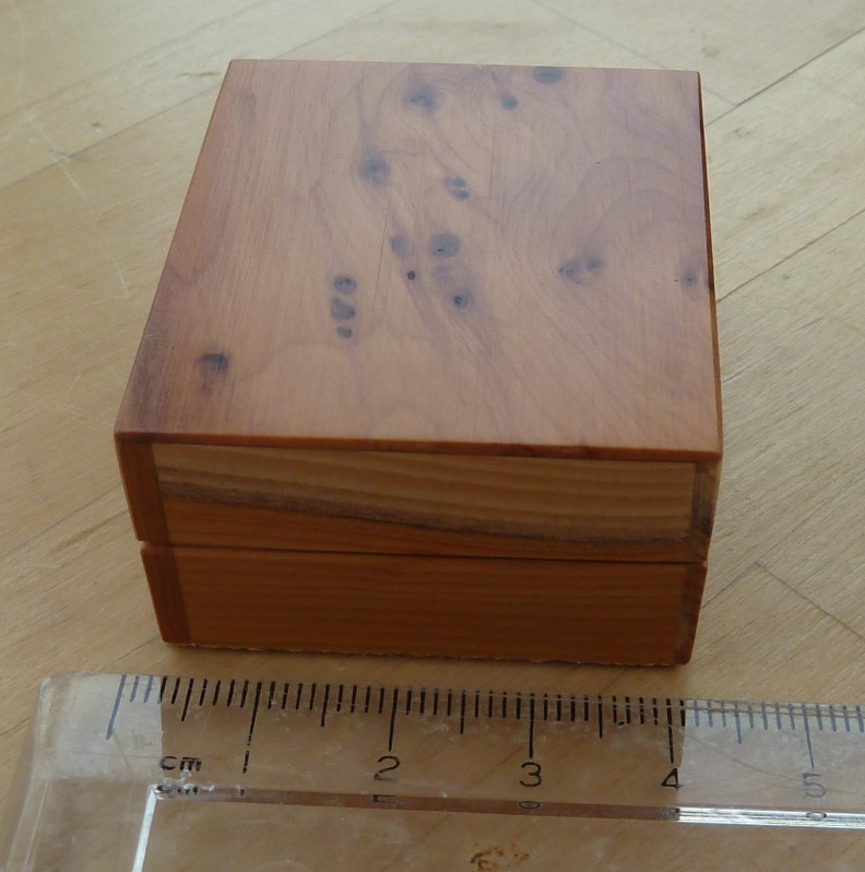 This is a single layer box in cherry with a hinged lid. This box was one of Shirley's favorites and shows some signs of use on the lid. Click here for a close up of the marks. Overall size is 227mm x 150mm x82mm Offers in the region of £80 |