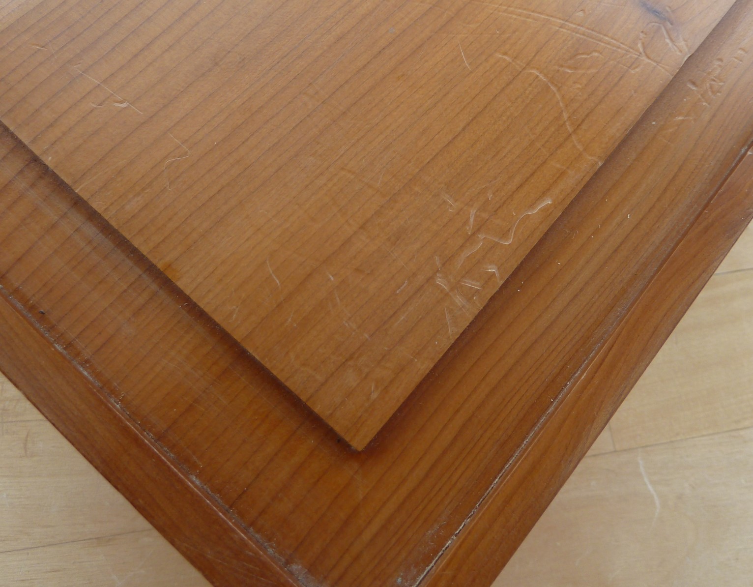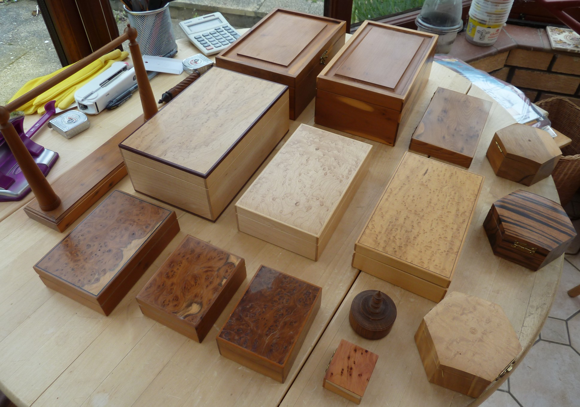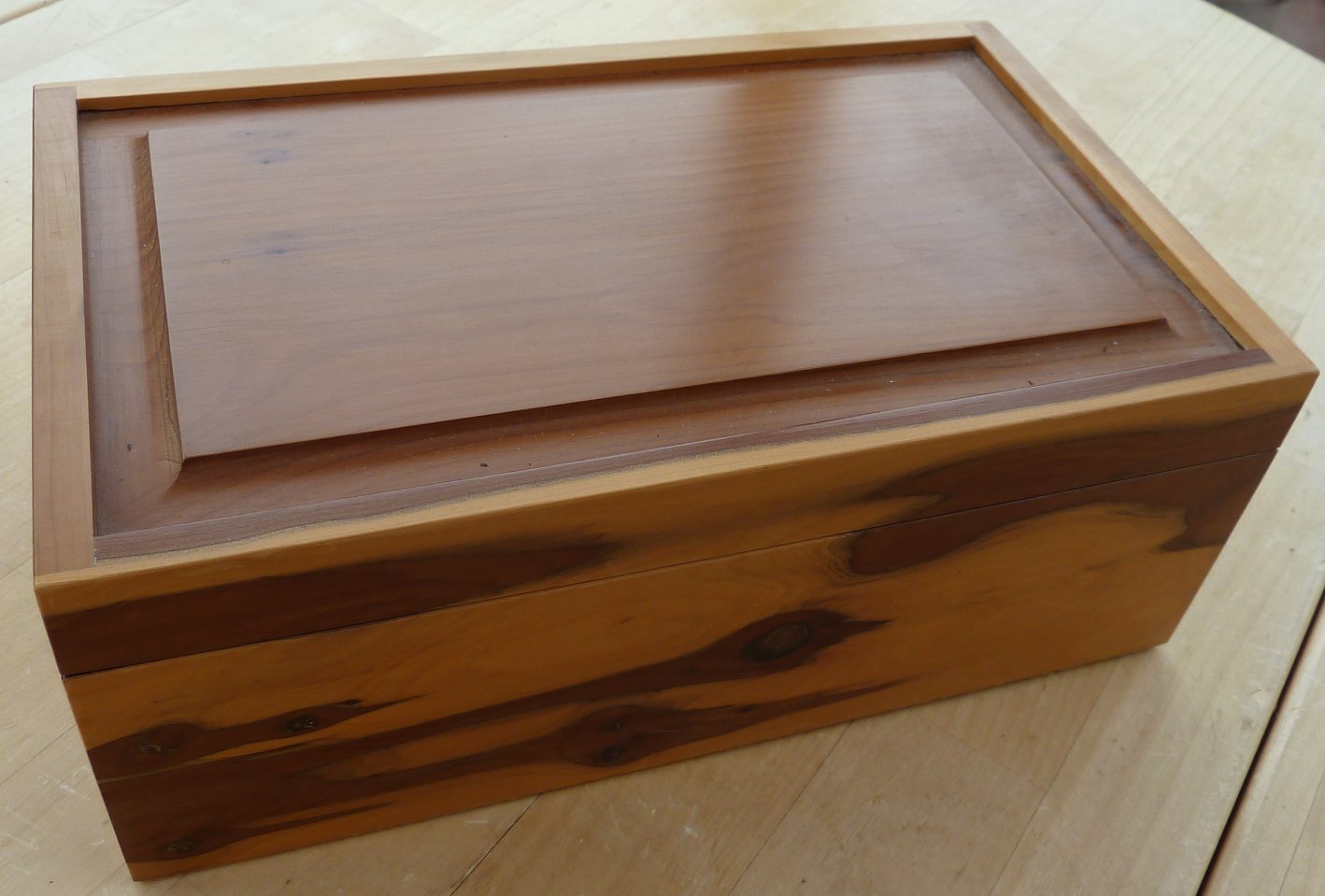 This is a single layer box in cherry with a hinged lid. This box was one of Shirley's favorites and shows some signs of use on the lid. Click here for a close up of the marks. Overall size is 227mm x 150mm x82mm Offers in the region of £80 |