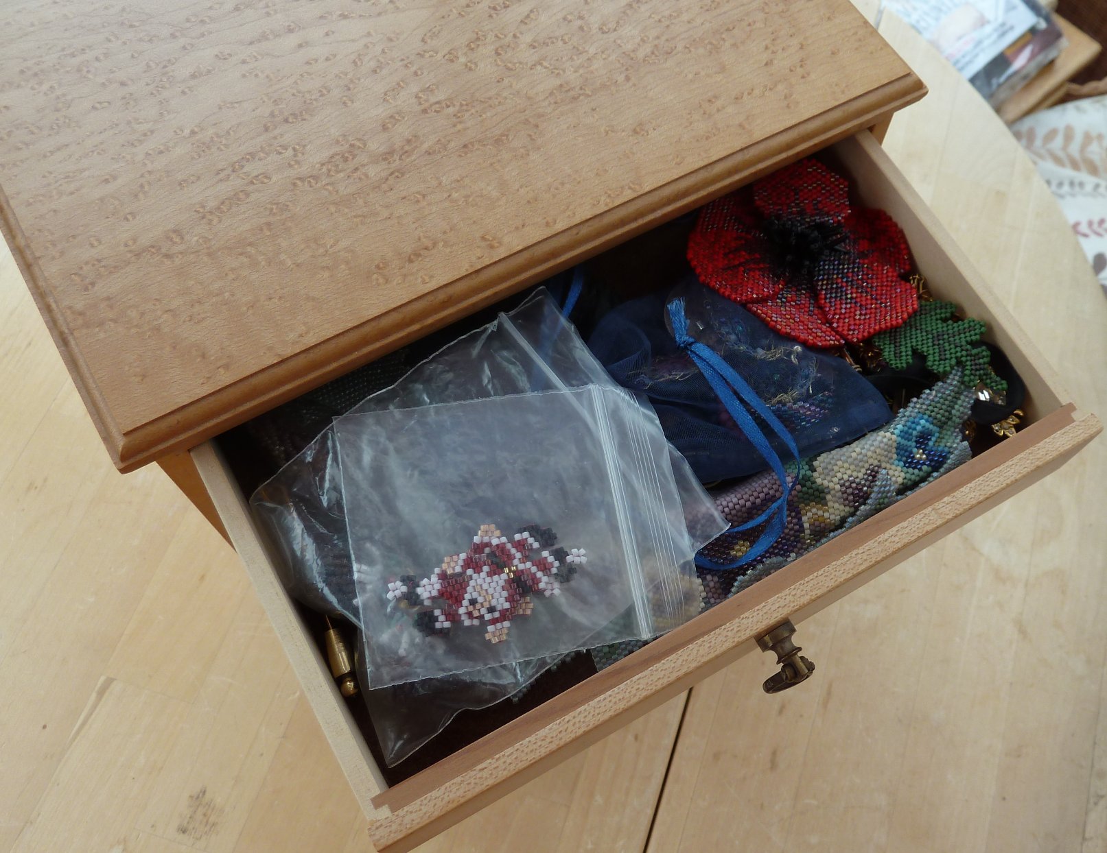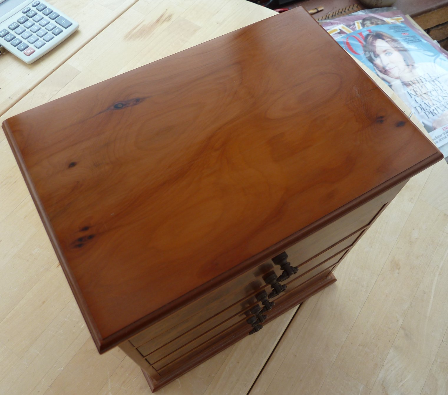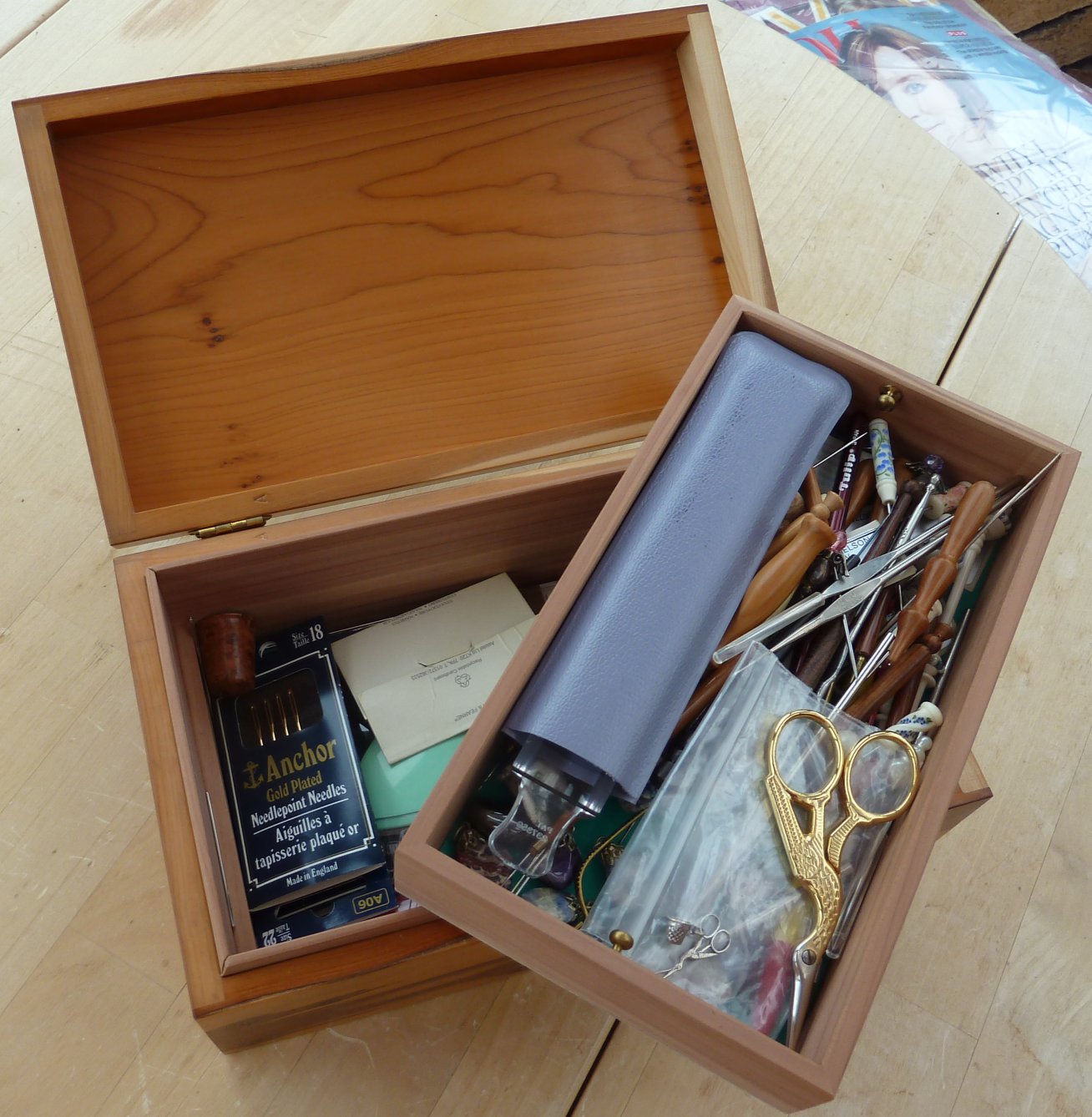 This is a shallow box in cherry with a hinged lid for lacemakers tools and other small objects. Overall size is 169mm x 98mm x20mm Offers in the region of £40 |
