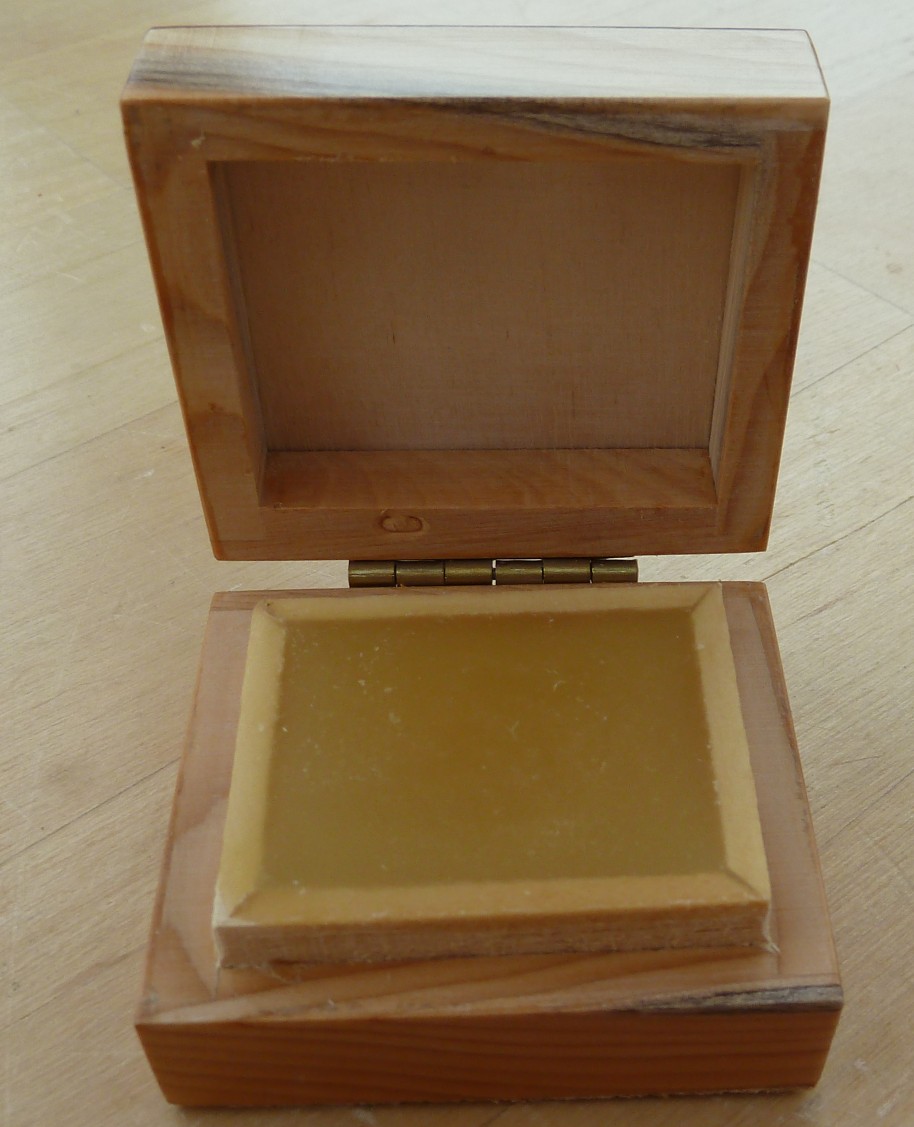This is a small box in yew with a hinged lid. The box is filled with wax which is used to lubricate the tool when pricking lace patterns The condition is as new and doesn't appear to have been used. Overall size is 46mm x 40mm x24mm Offers in the region of £15 (sold) |