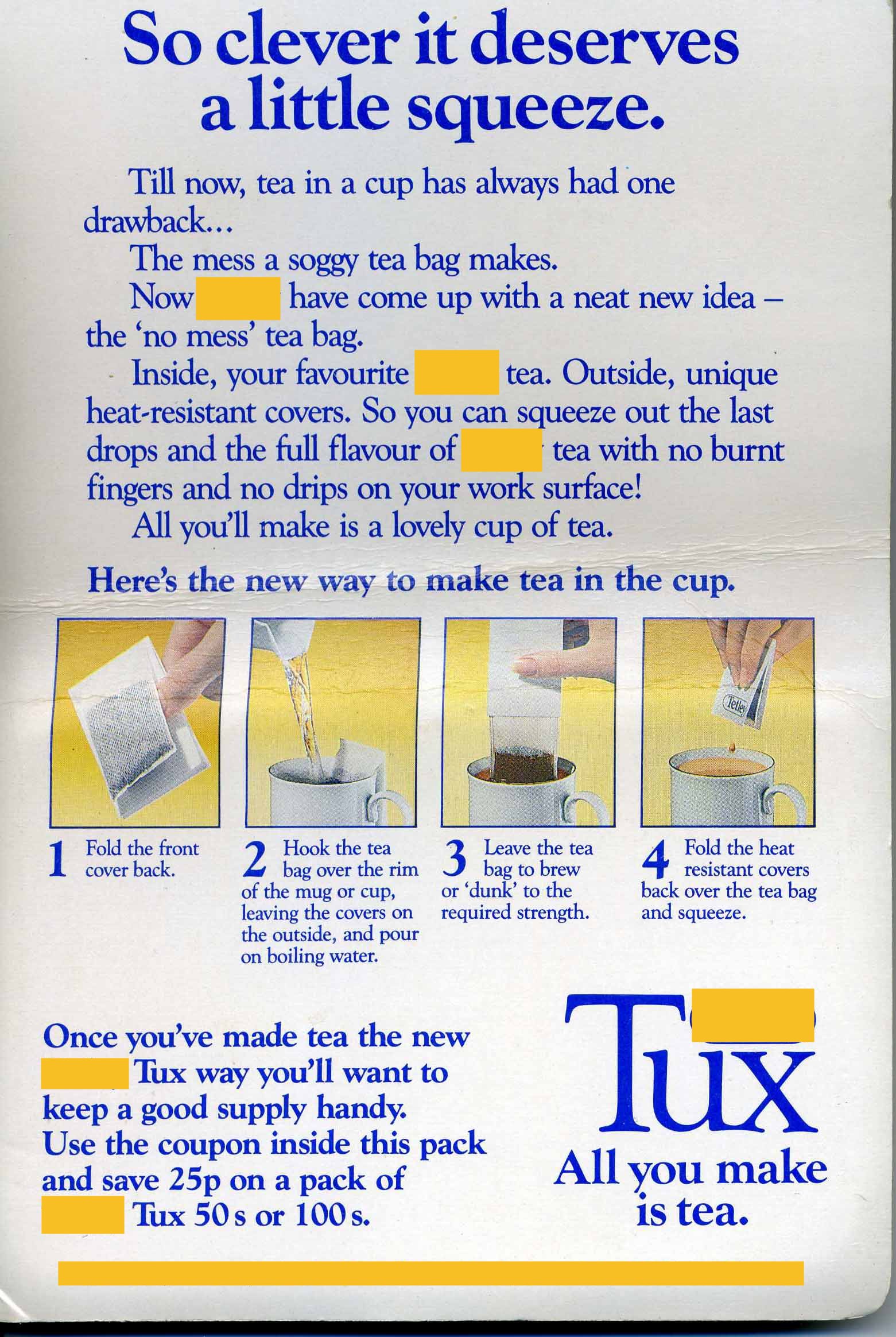 Tux was a non-drip teabag for a major UK company. This was quite complex to manufacture. I was responsible for a significant part of the design. Click here for more detailed information and pictures |