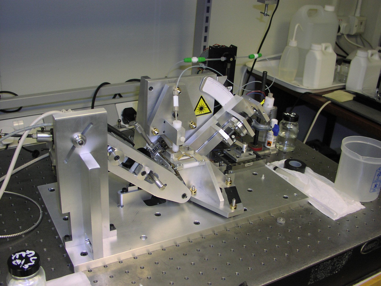 This is a prototype unit used for drug discovery. a coherent beam from a laser diode is split into 2 parallel beams and passed through two elements of a sample before being recombined into a single beam and focused onto a detector.