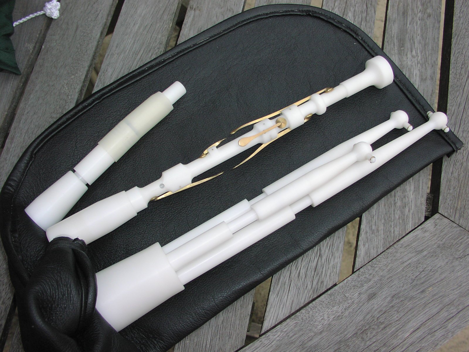 This is the 11 keyed set I made back in 1985 and is the set that I currently play. The chanter is the 11-keyed chanter that Kathryn Tickell played for many years until I swapped it with a 16-keyed chanter some years ago. This is the 5-keyed prototype set I made for the school pipes project that was run by FolkWorks (I think) back in 2006. The aim of the project was to make pipes available for teaching in mainstream school music in the Northeast at a price that was affordable. The target was to make a concert G set of pipes for a price of less than £200. To achieve this, considerable innovation was needed to allow the parts to be made in quantity and to be interchangeable. In the end we didn't have enough funding to do the keyed set but the unkeyed set was produced. This chanter is now with Anthony Robb |