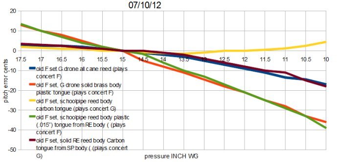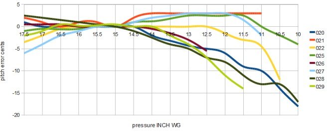 The testing was done in a concert G drone, made for use in the Schoolpipes, by adjusting the drone to play as close to concert G as possible when the pressure was 15"WG (15 inches water gauge). The pressure was then changed by 0.5"WG and a reading taken of the change in pitch. This was repeated for pressures above 15"WG up to 17.5"WG, the maximum the test rig provides) and down until the reed stopped sounding (or when I felt that any lower would add no value to the data). All this data was recorded and loaded into a spreadsheet to create the graphs.