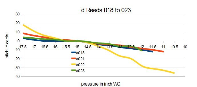 This set of reeds is from some that I made during my search for a really reliable reed for the Schoolpipe Project. I had noticed that the results I was getting were quite insensitive to pressure changes and this is shown in the graphs. This design has also proved totally reliable and continues to work without the need for any intervention. All of the reeds in this set were stable to better than 5cents for 2"WG pressure deviation. One of the reeds (021) is different to the rest and that reed has a narrower carbon blade (about 3.3 wide) compared to the 4mm wide blades of all the others. |