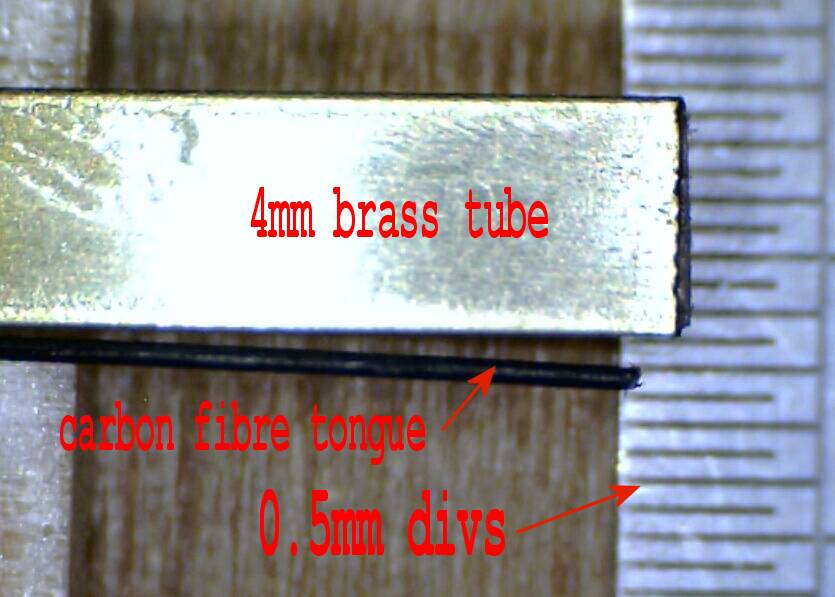The testing of these reeds was done in my test rig as described above. The reeds and the tongues were as close to identical as I can manage. All the reeds were G reeds made to the drawings above and fitted with 4mm wide x 0.39mm thick carbon fibre tongues also as described above.