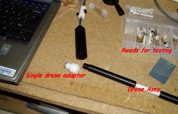 I have now set up some 45 drone reeds using the testing rig and it has proved extremely useful. The reeds I have been making are for the School pipes and I am attempting to address one of the problems with the roll out of these pipes and that is the non-availability of reliable replacement reeds.
